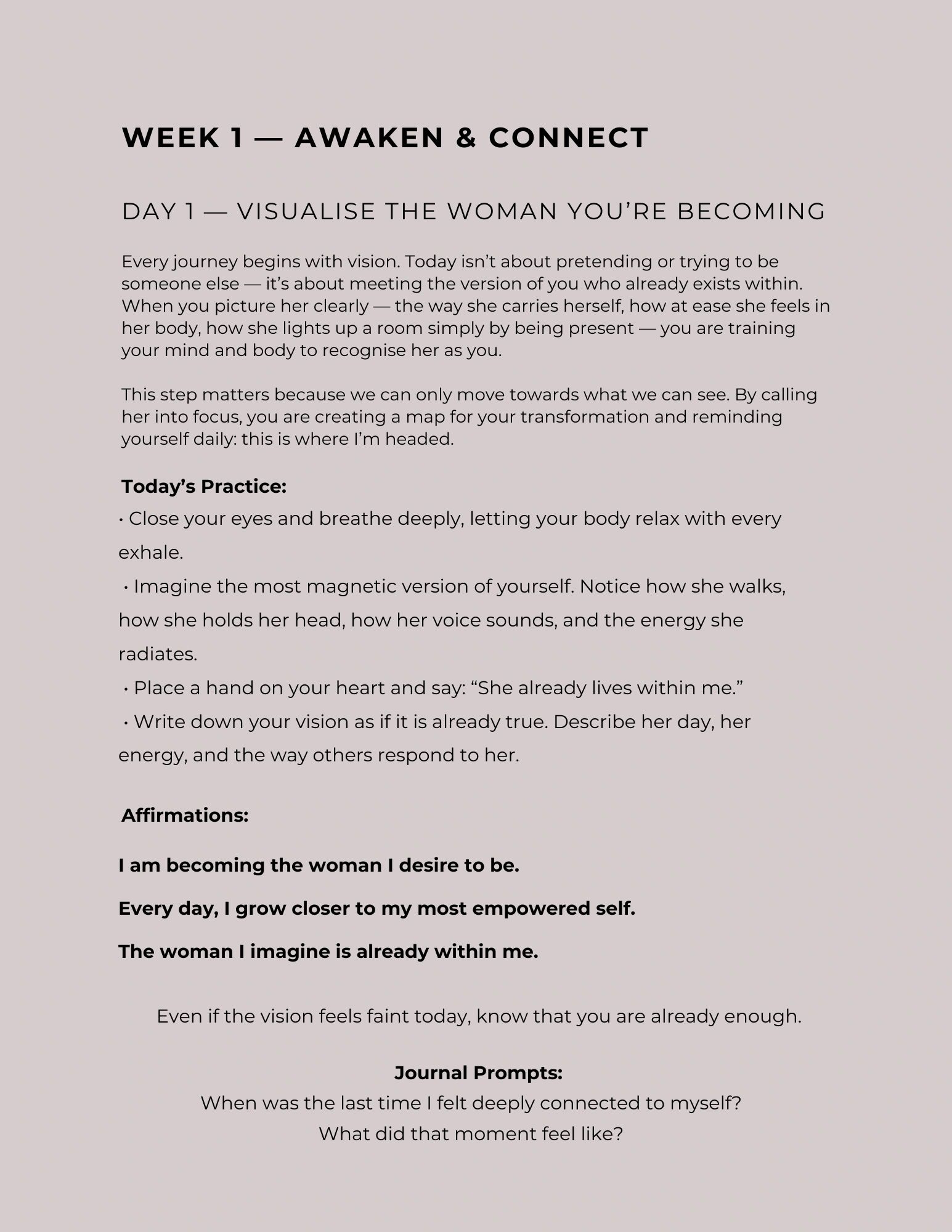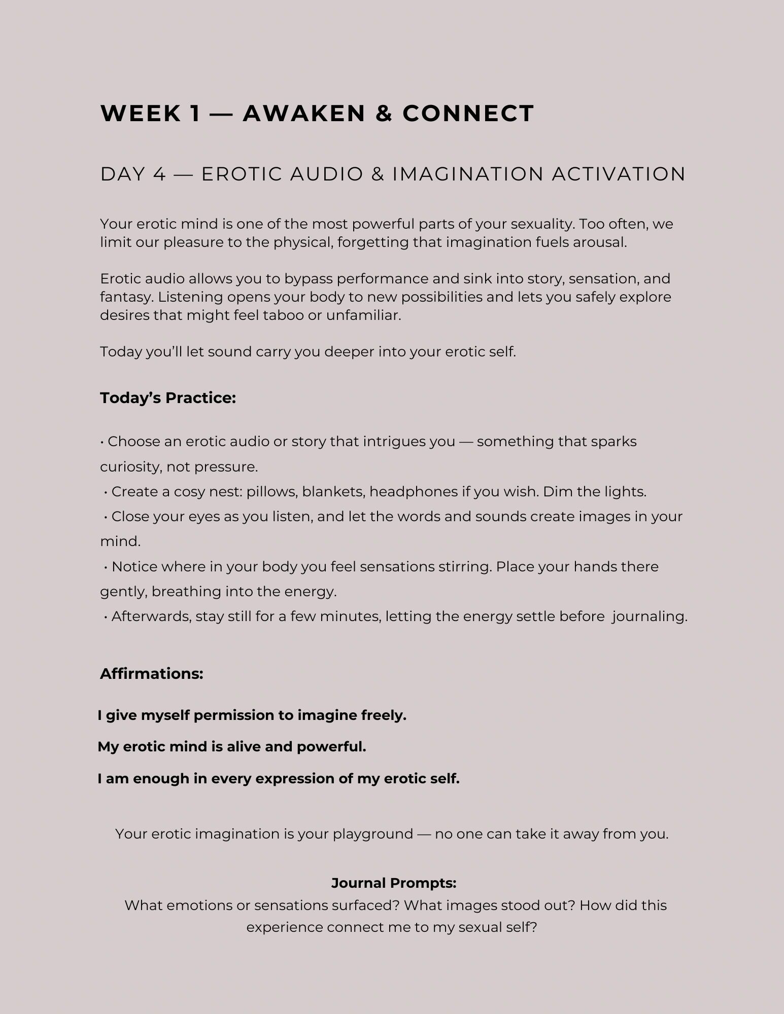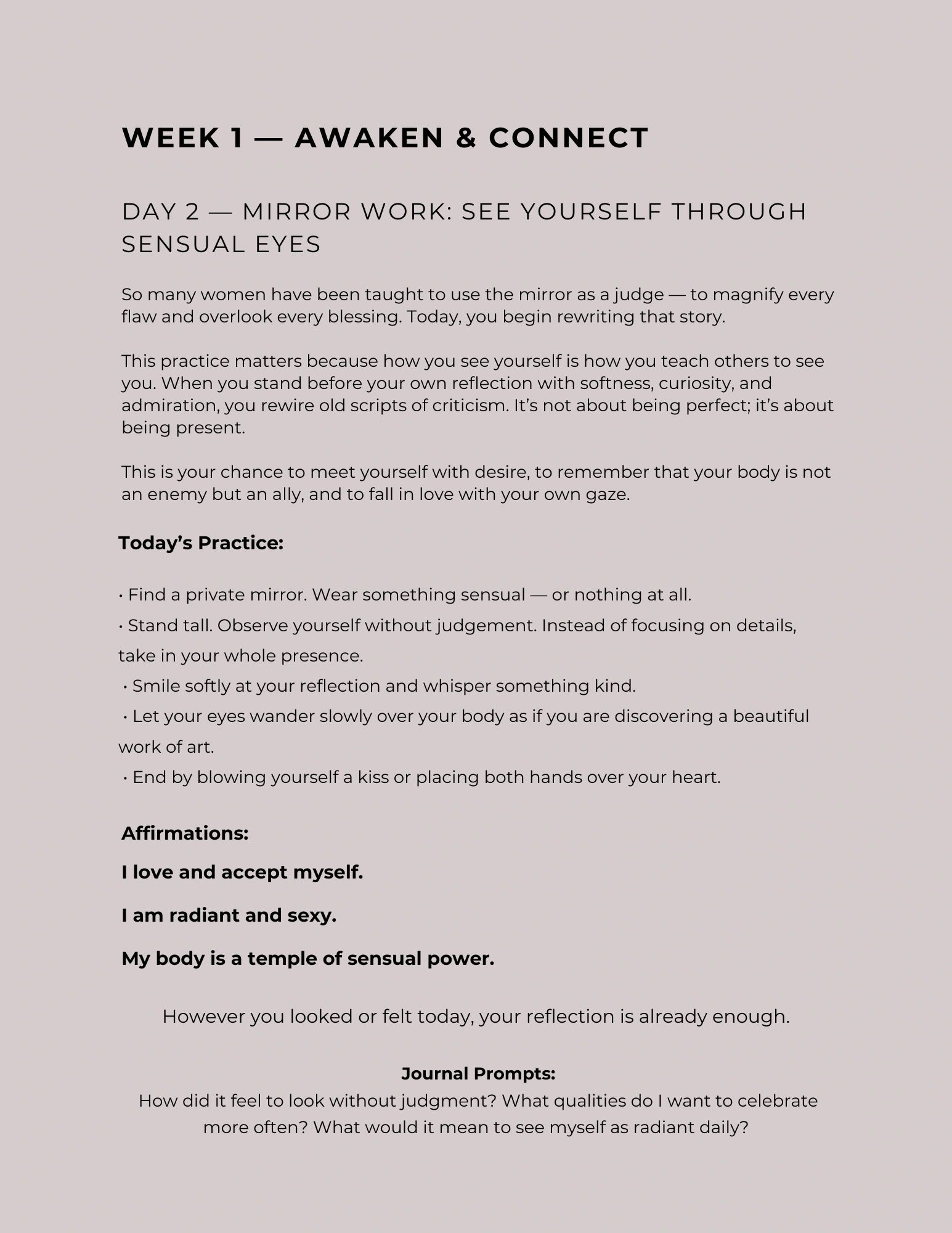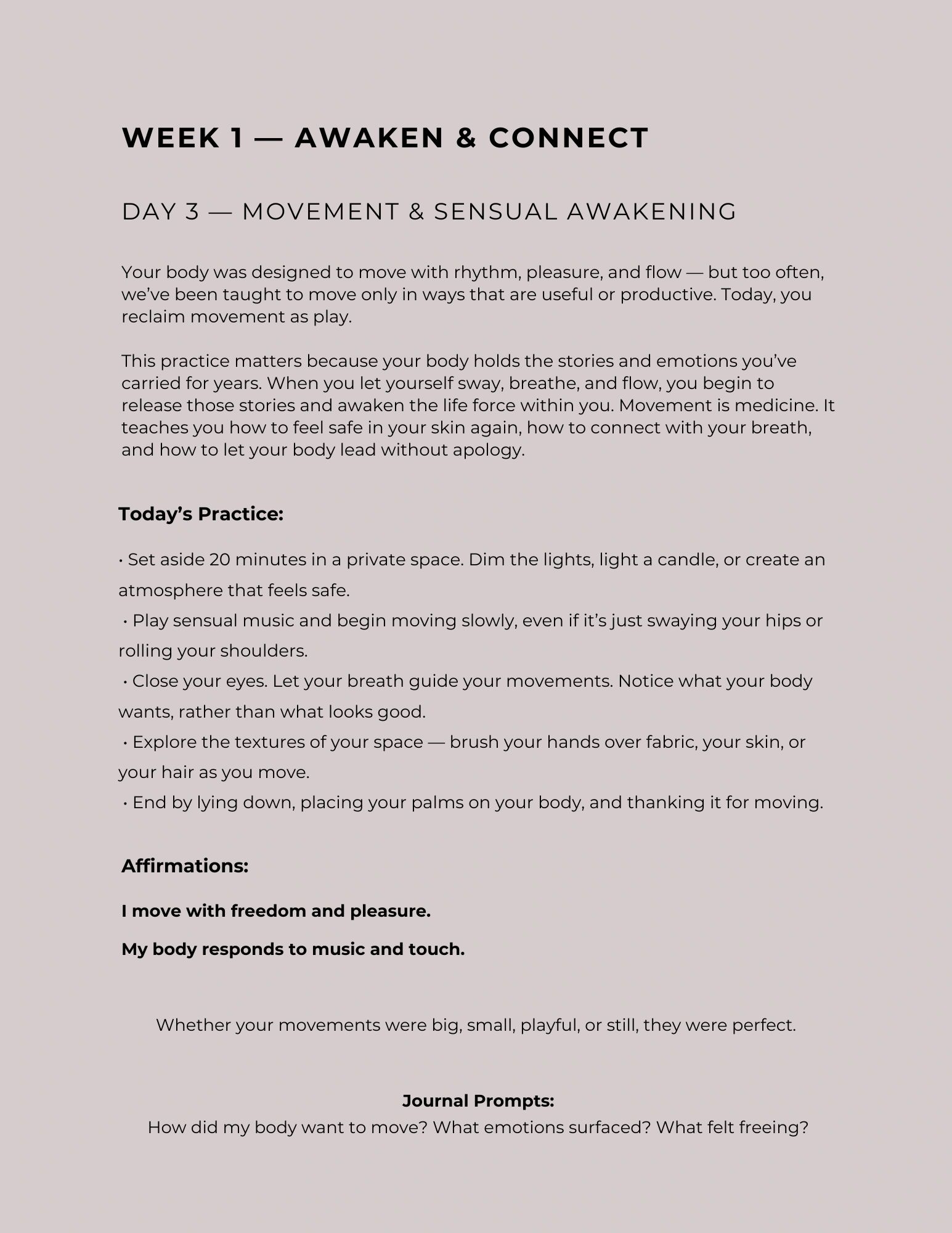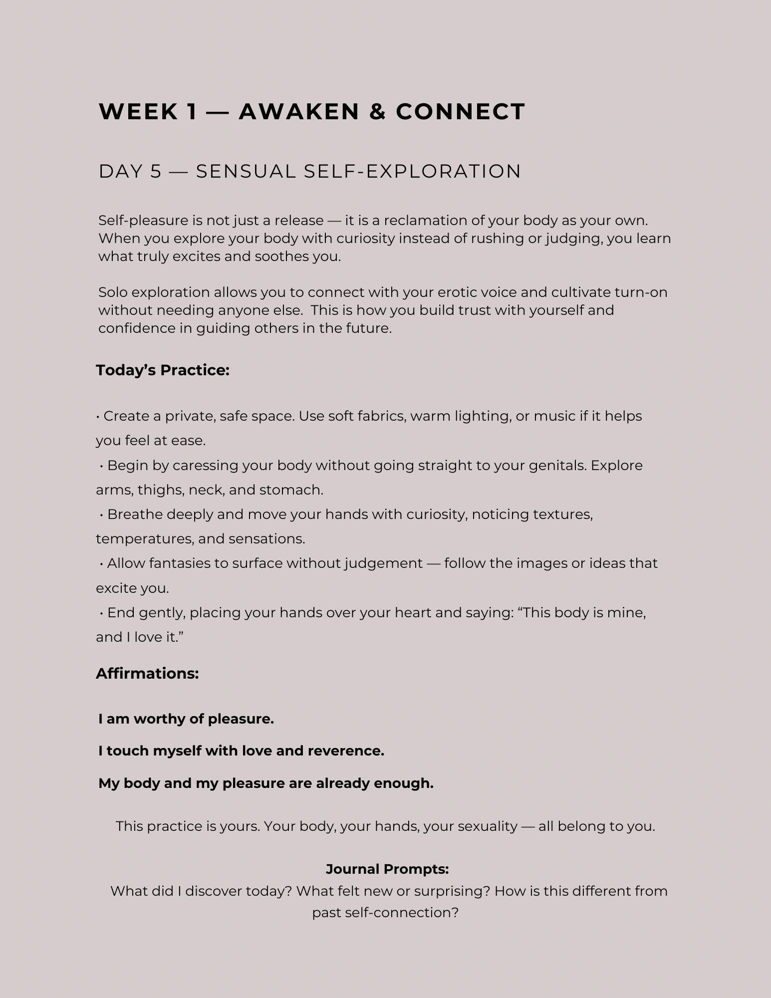 Through activities and exercises, the next 7-days will guide you towards Awakening Your Sensuality, Enhancing Your Confidence and Transforming Your Intimacy. By dedicating just a small amount of time to focus on you, your mindset, your practical tasks and your pleasure, you will see significant improvements in your sexual wellness and overall well-being.